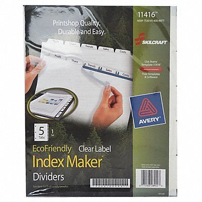 Binder Divider Index Tab Type Print-On Labels Tab Message Blank Index Tab Color White Number of Tabs 5 Width 8 1/2 in Height 11 in Tab Cuts Visible 5 Thickness 0.007 mil Material Paper For Use With 3 Ring Binders Laser/InkJet Printers Binder Divider
