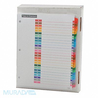 Binder Divider Index Tab Type Preprinted Tabs Tab Message A to Z Table of Contents Index Tab Color Multicolor Number of Tabs 26 Width 8 1/2 in Height 11 in Tab Cuts Visible 24 Thickness 0.0072 mil Material Paper For Use With 3 Ring Binders Laser/InkJet Printers Binder Divider
