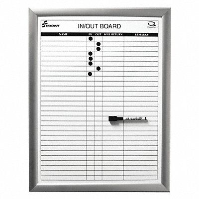 In/Out Board Board Properties Magnetic Mounting/Mobility Type Wall Mounted Dry Erase Surface Type Melamine Dry Erase Height 24 in Dry Erase Width 18 in Includes Dry Erase Marker and (29) Magnets Board Frame Material Aluminum Frame Color Silver Board Color White In/Out Board