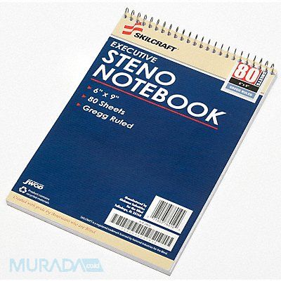 Steno Note Pad Cover Color Blue Cover Material Card Stock Binding Wirebound Binding Location Top Backing Semi-Rigid Total Number of Sheets 80 Sheet Size 6 in x 9 in Rule Gregg Margin No Paper Color White Paper Weight 16 lb Pages Numbered No Number of Carbon Sheets 0 Recycled Content 30 Percent National Stock No NSN - 7530-00-223-7939 Includes Horizontal Lines 11/32 in Apart with One Vertical Line Down the Center Features Elemental Chlorine-Free (ECF) Paper