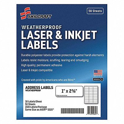Multipurpose Labels Avery Template Number 5 526 Label Height 1 in Label Width 2 5/8 in Color White Permanent Adhesive Material Polyester Laminated No Labels per Sheet 30 Total Number of Labels 50 Recycled Content 0 Percent Package Quantity 1500