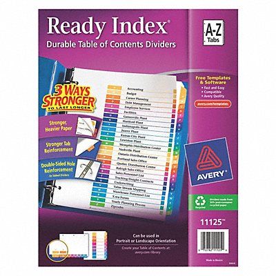 Binder Divider Index Tab Type Preprinted Tabs Tab Message A to Z Table of Contents Index Tab Color Multicolor Divider Color White Number of Tabs 26 Width 8 1/2 in Height 11 in Tab Cuts Visible 26 Thickness 0.007 mil Material Paper For Use With 3 Ring Binders Laser/InkJet Printers Binder Divider