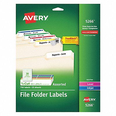 Laser/Inkjet Label Avery Template Number 5 266 For Use With Laser/Inkjet Label Height 2/3 in Label Width 3 7/16 in Color Blue Green Red White Yellow Permanent Adhesive Material Paper Laminated No Labels per Sheet 30 Total Number of Labels 750 Recycled Content 0 Percent Package Quantity 750