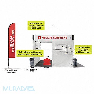 Medical Screening Kit Length 10 ft Width 10 ft Center Height 6 ft 11 in White Material Vinyl Fire Rating CAN/ULC-S109 CPAI-84 NFPA-701 Includes 16 Slim Blade ProFlagTM Deluxe Roller Bag Deluxe Weight Bag set Medical Cube Shelter