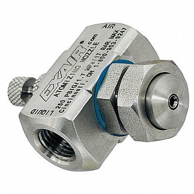 Atomizing Spray Nozzle Fluid Delivery Type Siphon Fluid Delivery Speed Low Flow Rate 0.3 to 5.8 gph Max Siphon Height 36 in Spray Pattern @ 15 in 8-5/16 in dia Material Stainless Steel Thread Size 1/4 FNPT Air Consumption 1.4 to 5.5 scfm Max Working Pressure 250 psig Features Siphon Fed Nozzles Do Not Require Pressurized Liquid Can Be Gravity Fed or Lift From A Siphon Height Up to 36 in Can Be Used with Liquids Up to 200 Centipoise