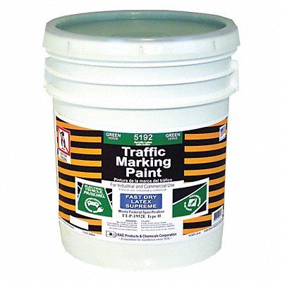 Traffic Zone Marking Paint Latex Acrylic Base Type Line Striping Aerosol No Green Size 5 gal Traffic Zone Marking Paint Paint and Primer Surface Material Asphalt Brick Concrete Grass Paint and Primer Application Method Striping Machine Coverage 420 Linear ft/gal (4 in Strip) Net Weight 18.9 L Dry Time 1 hr Dry Time Tack Free 5 min Application Temperature 40 Degrees to 90 Degrees F Mild to Moderate Exposure Conditions VOC Content 108 g/L Standards TT-P-1952E Type II