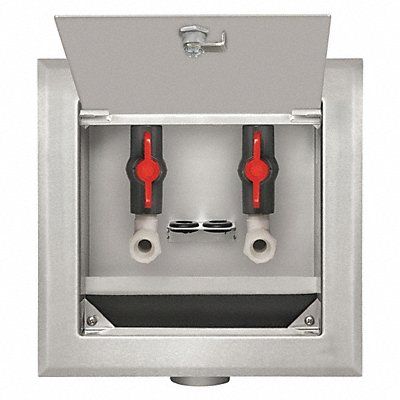 Outlet Box Two Valves Locking Door Inlet Connection 1/2 in MIP Box Width 8.63 in Box Height 11.25 in Box Depth 3.50 in Drain Location Center Valve Connection 1/4 in Turn Material of Construction 316 Stainless Steel Duplex Receptacle None Standards NSF Compliance ASTM F1970-05