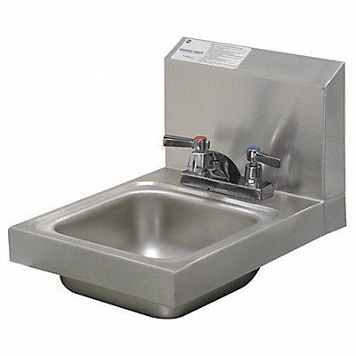 Hand Sink ADA Compliance No Back Splash Height 8 in Bowl Depth 5 in Square Bowl Size 9 in x 9 in CEC Compliant Silver Drain Opening 2 in Faucet Body Material Brass Faucet Handle Type Lever Faucet Hole Dia 1/2 in Faucet Installation Style Centerset Faucet Mounting Centers 4 in Dual Manual Handle Low Arc Satin Flow Rate 1 gpm Gauge 20 ga Mounting Location - Faucet Deck Mounting Type - Sinks Wall No of Bowls 1 Number of Faucet Holes 2 Overall Height 13 in