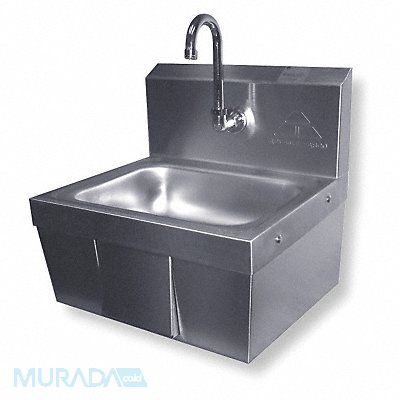 Hand Sink ADA Compliance No Back Splash Height 8 1/4 in Bowl Depth 5 in Rectangular Bowl Size 14 in x 10 in CEC Compliant Silver Drain Opening 3 1/2 in Faucet Body Material Brass Faucet Handle Type None Faucet Hole Dia 1 1/8 in Faucet Installation Style Centerset Faucet Mounting Centers 1 1/4 in Single Knee Pedal Gooseneck Satin Flow Rate 1 gpm Gauge 18 ga Mounting Location - Faucet Splash Mounting Type - Sinks Wall No of Bowls 1 Number of Faucet Holes 1