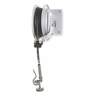 Hose Reel Reel Length 35 ft 3/8 in FNPT Inlet Deck Mounting Type - Faucet Silver Metallic Cover Faucet Operation Manual Includes Heat Resistant Handle and Adjustable Hose Bumper Hose Multifit Bracket Flow Rate 3.89 gpm