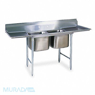 Two Compartment Coved Corner Sink ADA Compliance No Back Splash Height 9 1/2 in Bowl Depth 13 1/2 in Rectangular Bowl Size 16 in x 20 in Silver Drain Opening 3 1/2 in Drainboard Length 18 in Drainboard Location Left Right Faucet Hole Dia 1 1/8 in Faucet Installation Style Widespread Faucet Mounting Centers 8 in Satin Gauge 16 ga Mounting Location - Faucet Splash Mounting Type - Sinks Floor No of Bowls 2 Number of Drainboards 2 Number of Faucet Holes 2 Overall Height 44 in