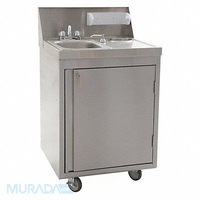 Portable Hand Sink ADA Compliance No Back Splash Height 8 3/4 in Bowl Depth 5 in Rectangular Bowl Size 10 in x 14 in Non CEC Compliant Silver Faucet Body Material Brass Faucet Handle Type Lever Faucet Hole Dia 1 in Faucet Installation Style Centerset Faucet Mounting Centers 4 in Dual Manual Handle Straight Satin Flow Rate 0.5 gpm For Use With Water Temperature Cold Water Fresh Water Capacity 5 gal Gray Water Capacity 7 gal Mounting Location - Faucet Deck