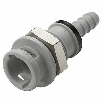 Coupler Application Air Non-Potable Water Fitting Side A Connection Type Barbed Fitting Side B Connection Type Coupler Fitting Side A Tube Inner Diameter 1/4 in Flow Control Type Shut-off Fitting Material Polypropylene Overall Length 2 1/16 in Specific Fitting Shape Panel Mount Coupler Standards FDA Approved RoHS USDA Color Gray Maximum Operating Pressure 45 psi Maximum Operating Temperature 160 Degrees F Minimum Operating Temperature 32 Degrees F