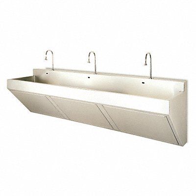 Scrub Sink ADA Compliance No Back Splash Height 4 in Bowl Depth 11 in Rectangular Bowl Size 17 1/4 in x 85 1/2 in Silver Drain Opening 3 in Faucet Body Material Stainless Steel Faucet Handle Type None Faucet Hole Dia 1 in Faucet Installation Style Single Hole Sensor Gooseneck Satin Flow Rate 1.2 gpm Gauge 16 ga Mounting Location - Faucet Wall Mounting Type - Sinks Wall No of Bowls 1 Number of Faucet Holes 3 Number of Stations 3 Overall Height 26 in Overall Length 90 in