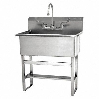 Scrub Sink ADA Compliance No Back Splash Height 8 in Bowl Depth 10 1/2 in Rectangular Bowl Size 22 in x 16 1/2 in CEC Compliant Silver Drain Opening 3 1/2 in Faucet Body Material Brass Faucet Handle Type Wristblade Faucet Hole Dia 7/8 in Faucet Installation Style Widespread Faucet Mounting Centers 8 in Dual Manual Handle Gooseneck Satin Flow Rate 0.5 gpm Gauge 14 ga Mounting Location - Faucet Splash Mounting Type - Sinks Floor No of Bowls 1 Number of Faucet Holes 2