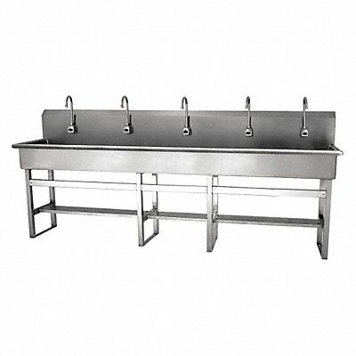 Wash Station ADA Compliance No Back Splash Height 10 in Bowl Depth 8 in Rectangular Bowl Size 97 in x 16 1/2 in CEC Compliant Silver Drain Opening 2 in Faucet Body Material Brass Faucet Handle Type None Faucet Hole Dia 7/8 in Faucet Installation Style Single Hole Sensor Gooseneck Satin Flow Rate 0.5 gpm Gauge 16 ga Mounting Location - Faucet Splash Mounting Type - Sinks Floor No of Bowls 1 Number of Faucet Holes 5 Number of Stations 5 Overall Height 45 in