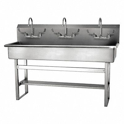 Wash Station ADA Compliance No Back Splash Height 10 in Bowl Depth 8 in Rectangular Bowl Size 57 in x 16 1/2 in CEC Compliant Silver Drain Opening 2 in Faucet Body Material Brass Faucet Handle Type Wristblade Faucet Hole Dia 7/8 in Faucet Installation Style Widespread Faucet Mounting Centers 8 in Dual Manual Handle Gooseneck Satin Flow Rate 0.5 gpm Gauge 16 ga Mounting Location - Faucet Splash Mounting Type - Sinks Floor No of Bowls 1 Number of Faucet Holes 6