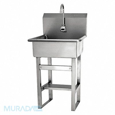 Hand Sink ADA Compliance No Back Splash Height 10 1/2 in Bowl Depth 9 in Rectangular Bowl Size 20 in x 17 in Silver Drain Opening 2 in Faucet Body Material Stainless Steel Faucet Handle Type None Faucet Hole Dia 7/8 in Faucet Installation Style Single Hole Sensor Gooseneck Satin Flow Rate 0.5 gpm Gauge 16 ga Mounting Location - Faucet Deck Mounting Type - Sinks Floor No of Bowls 1 Number of Faucet Holes 1 Number of Stations 1 Overall Height 46 1/2 in Overall Length 23 in