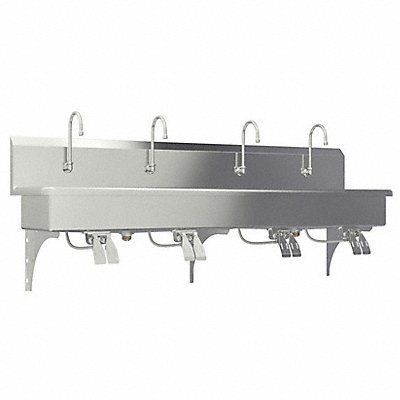 Wash Station ADA Compliance No Back Splash Height 10 in Bowl Depth 8 in Rectangular Bowl Size 77 in x 16 1/2 in Non CEC Compliant Silver Drain Opening 2 in Faucet Body Material Brass Faucet Handle Type None Faucet Hole Dia 7/8 in Faucet Installation Style Single Hole Dual Knee Pedal Gooseneck Satin Flow Rate 2 gpm Gauge 16 ga Mounting Location - Faucet Splash Mounting Type - Sinks Wall No of Bowls 1 Number of Faucet Holes 4 Number of Stations 4 Overall Height 18 in