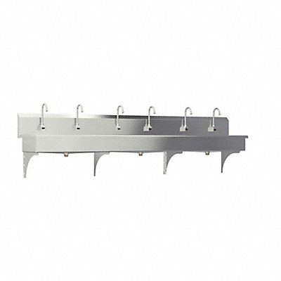 Wash Station ADA Compliance No Back Splash Height 10 in Bowl Depth 8 in Rectangular Bowl Size 117 in x 16 1/2 in Non CEC Compliant Silver Drain Opening 2 in Faucet Body Material Brass Faucet Handle Type None Faucet Hole Dia 7/8 in Faucet Installation Style Single Hole Sensor Gooseneck Satin Flow Rate 2 gpm Gauge 16 ga Mounting Location - Faucet Splash Mounting Type - Sinks Wall No of Bowls 1 Number of Faucet Holes 6 Number of Stations 6 Overall Height 18 in