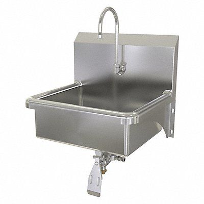 Hand Sink ADA Compliance No Back Splash Height 9 1/2 in Bowl Depth 7 in Rectangular Bowl Size 17 in x 14 in CEC Compliant Silver Drain Opening 2 in Faucet Body Material Brass Faucet Handle Type None Faucet Hole Dia 7/8 in Faucet Installation Style Single Hole Single Knee Pedal Gooseneck Satin Flow Rate 0.5 gpm Gauge 16 ga Mounting Location - Faucet Splash Mounting Type - Sinks Wall No of Bowls 1 Number of Faucet Holes 1 Number of Stations 1 Overall Height 16 1/2 in