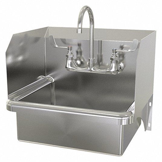 Hand Sink ADA Compliance No Back Splash Height 9 1/2 in Bowl Depth 7 in Rectangular Bowl Size 17 in x 14 in CEC Compliant Silver Drain Opening 2 in Faucet Body Material Brass Faucet Handle Type Wristblade Faucet Hole Dia 7/8 in Faucet Installation Style Widespread Faucet Mounting Centers 8 in Dual Manual Handle Gooseneck Satin Flow Rate 0.5 gpm Gauge 16 ga Mounting Location - Faucet Splash Mounting Type - Sinks Wall No of Bowls 1 Number of Faucet Holes 2