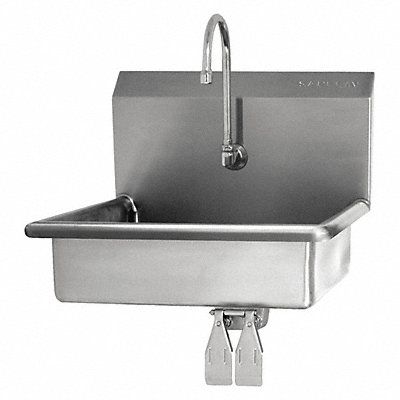 Hand Sink ADA Compliance Yes Back Splash Height 9 in Bowl Depth 5 in Rectangular Bowl Size 19 in x 15 1/2 in Non CEC Compliant Silver Drain Opening 2 in Faucet Body Material Brass Faucet Handle Type None Faucet Hole Dia 7/8 in Faucet Installation Style Single Hole Dual Knee Pedal Gooseneck Satin Flow Rate 2 gpm Gauge 16 ga Mounting Location - Faucet Splash Mounting Type - Sinks Wall No of Bowls 1 Number of Faucet Holes 1 Number of Stations 1 Overall Height 14 in