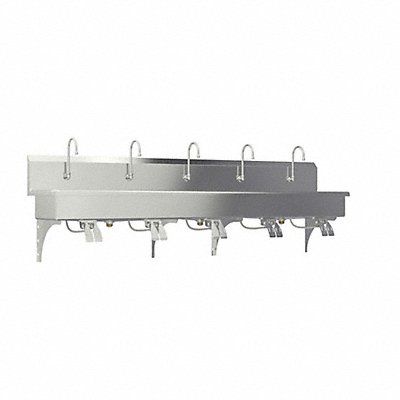 Hands-Free Wall Mounted Wash Station ADA Compliance No Back Splash Height 10 in Bowl Depth 8 in Rectangular Bowl Size 97 in x 16 1/2 in CEC Compliant Silver Drain Opening 2 in Faucet Body Material Brass Faucet Handle Type None Faucet Hole Dia 7/8 in Faucet Installation Style Single Hole Dual Knee Pedal Gooseneck Satin Flow Rate 0.5 gpm Gauge 16 ga Mounting Location - Faucet Splash Mounting Type - Sinks Wall No of Bowls 1 Number of Faucet Holes 5 Number of Stations 5