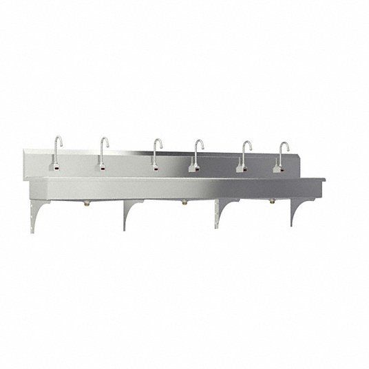 Hands-Free Wall Mounted Wash Station ADA Compliance No Back Splash Height 10 in Bowl Depth 8 in Rectangular Bowl Size 117 in x 16 1/2 in CEC Compliant Silver Drain Opening 2 in Faucet Body Material Brass Faucet Handle Type None Faucet Hole Dia 7/8 in Faucet Installation Style Single Hole Sensor Gooseneck Satin Flow Rate 0.5 gpm Gauge 16 ga Mounting Location - Faucet Splash Mounting Type - Sinks Wall No of Bowls 1 Number of Faucet Holes 6 Number of Stations 6