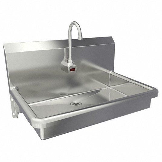 Hand Sink ADA Compliance Yes Back Splash Height 10 in Bowl Depth 5 in Rectangular Bowl Size 27 in x 16 1/2 in Silver Drain Opening 2 in Faucet Body Material Stainless Steel Faucet Handle Type None Faucet Hole Dia 7/8 in Faucet Installation Style Single Hole Sensor Gooseneck Satin Flow Rate 0.5 gpm Gauge 16 ga Mounting Location - Faucet Deck Mounting Type - Sinks Wall No of Bowls 1 Number of Faucet Holes 1 Number of Stations 1 Overall Height 15 in Overall Length 30 in
