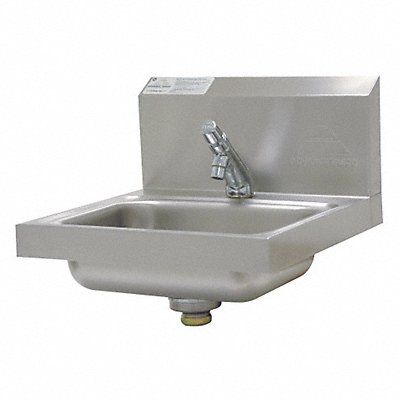 Hand Sink ADA Compliance No Back Splash Height 8 in Bowl Depth 5 in Rectangular Bowl Size 14 in x 10 in CEC Compliant Silver Drain Opening 3 1/2 in Faucet Body Material Brass Faucet Handle Type Push Button Faucet Hole Dia 1 1/8 in Faucet Installation Style Centerset Faucet Mounting Centers 4 in Single Metering Gooseneck Satin Flow Rate 2.2 gpm Gauge 20 ga Mounting Location - Faucet Deck Mounting Type - Sinks Wall No of Bowls 1 Number of Faucet Holes 2