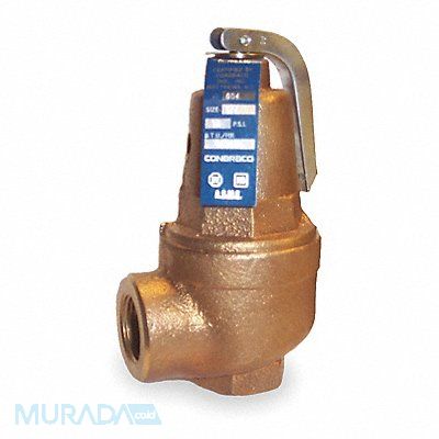 Safety Relief Valve Body Material Bronze Inlet Type FNPT Outlet Type FNPT Inlet Size 1 in Outlet Size 1 in Factory Set Pressure 100 psi Pressure Range 15 to 160 psi 3 500 000 BtuH Disc Material Brass ASTM B16 Overall Height 6 11/16 in Application Hot Water Heating Boilers and Hot Water Supply Systems Overall Length 4 in Seat Material Silicone Spring Material Plated Alloy Steel Temp Range 0 Degrees to 250 Degrees F Test Lever Yes Standards ASME Section IV CRN CSA