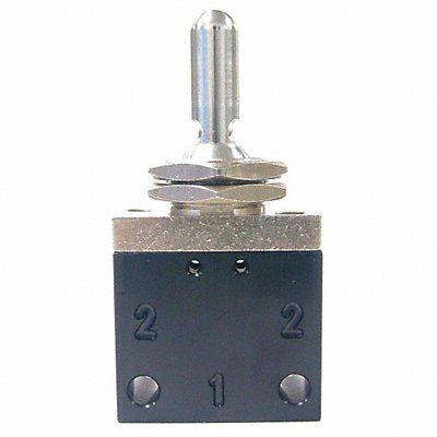 Toggle Valve Valve Design 3-Way 3 Position Body Material Aluminum / Brass Connection Type NPT Pipe Size 1/8 Max Pressure 125 psi 50 cfm CFM @ 75 PSI Temp Range -20 Degrees to 160 Degrees F Coefficient of Volume 0.47 Handle Type Detented Metal Toggle Overall Length 3.03 in Seal Material Buna-N Seat Material Buna-N Stem Material Brass