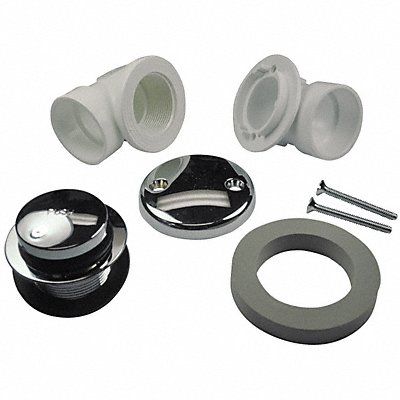 Waste and Two Hole Overflow Half Kit Bath Waste and Overflow Pipe Dia - Drains 1 1/2 in Shape - Drains Round Drain Material Sched 40 PVC Grid Material Stainless Steel Color - Drains Chrome Connection - Drains Solvent Weld Length - Drains 2 1/2 in For Use With Bath Drain with Touch Stopper 0.75 Gauge Standards CSA / IAPMO Includes 2-hole Bath Waste Half Kit Touch Toe Stopper