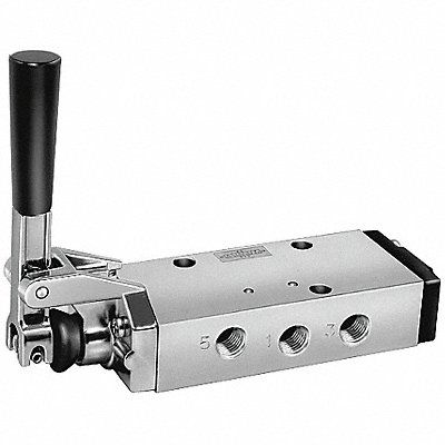 Manual Air Control Valve Valve Ways and Positions 4-Way/2-Position Valve Port Size 3/8 in Connection NPT Valve Actuator / Return Lever / Spring Max CFM - Valves 2.9 cfm Valve Max Pressure Rating 150 psi Valve Temp Range 0 Degrees to 140 Degrees F Coefficient of Volume 2.9 Body Material Aluminum Overall Length 6 3/4 in Overall Height 5 in Overall Width 2 1/4 in Series 42 Manual Air Control Valve