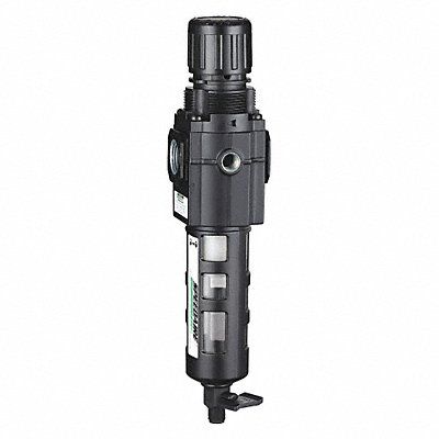 Filter-Regulator Filter Bowl Material Polycarbonate with Guard Air Inlet Size 1/4 in Air Inlet Type NPT Maximum Flow Rate 80 cfm Filter Rating 40 micron Filter Type Particulate Maximum Operating Pressure 150 psi Drain Type Manual Pressure Gauge Included No Body Material Zinc Overall Width 2 in Series Compact Adjustment Location Top Adjustment Mechanism Knob Adjustment Mechanism Material Reinforced Nylon Air Flow Direction Left to Right Air Inlet Gender Female