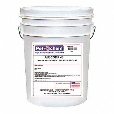 Compressor Oil Container Size 5 gal Container Type Pail SAE Grade 15 ISO Viscosity Grade 46 Viscosity Index 97 Flash Point 460 Degrees F Food Grade No Series Air-Comp Series Application Air-Oilers Air-Tools And Are Compatible In Ammonia Refrigerant Systems Bearings Cables Compressors Drip Oilers Gear Head Motors Multistage Reciprocating Compressors Roller Chains Stationary Rotary Vane And Screw Compressors Water Pumps Viscosity @ 40C 45.8 cSt Viscosity @ 100C 6.7 cSt