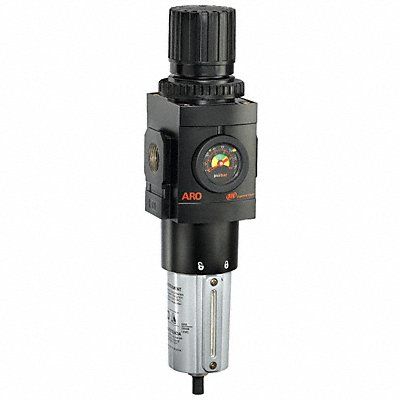Filter-Regulator Filter Bowl Material Metal Air Inlet Size 1 in Air Inlet Type NPT Maximum Flow Rate 250 cfm Filter Rating 5 micron Maximum Operating Pressure 250 psi Drain Type Manual Pressure Gauge Included Yes Body Material Aluminum Overall Width 3 9/16 in Series 3000 Adjustment Mechanism Knob Air Outlet Size 1 in Air Outlet Type NPT Differential Pressure Indicator Included Yes Drain Included Yes Drain Part Compatibility 104322 Filter Bowl Capacity 5.3 oz