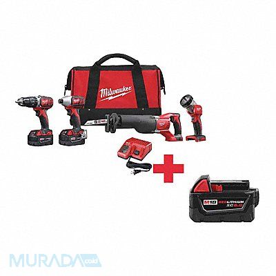 Cordless Combination Kit Cordless Tools Included Hammer Drill Impact Driver Reciprocating Saw Work Light Voltage 18V DC Power Source Cordless Number of Tools 4 Battery Capacity (1) 3.0 Ah (1) 5.0 Ah Includes (1) Contractor Bag Tool Brand Milwaukee Series M18 Battery Included 2PYZ8 35GJ99 Number of Batteries Included 2 Battery Model No (1) Mfr No 48-11-1828 (1) Mfr No 48-11-1850 Battery Series M18 REDLITHIUM Charger (1) 23Y581 Charger Included Yes