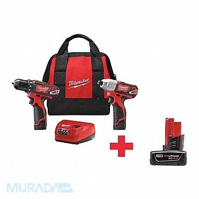 Cordless Combination Kit Cordless Tools Included Drill Impact Driver Voltage 12V DC Power Source Cordless Number of Tools 2 Battery Capacity (1) 6.0 Ah (2) 1.5 Ah Tool Brand Milwaukee Series M12 Battery Included (1) 49JV08 (2) 2XKZ6 Number of Batteries Included 3 Battery Model No (1) Mfr No 48-11-2460 (2) Mfr No 48-11-2401 Battery Series M12 REDLITHIUM Charger (1) 2XKZ7 Charger Included Yes Cordless Tool Kit Contents (2) Bare Tools (3) Batteries (1) Charger
