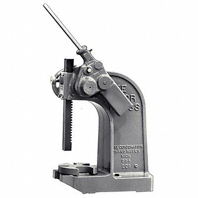 Arbor Press Force in Tons 6 ton Force Range (Lbs.) 0 to 24000 Swing (In.) 7 3/4 in Table Work Surface (In.) 6-3/4 x 6-3/4 Anvil Dia Work Area (In.) 8 in Range of Slot Widths (In.) 1 to 5-1/2 Max Work Height (In.) 15 in Ram Dimensions (In.) 1.5 x 1.5 x 19 Height (In.) 26 in Width (In.) 8 1/4 in Depth (In.) 20 in Base Size (In.) 8-1/4x 24 Machined Gray Iron Cast Frame With Heat Treated And Ground Spindle Heat Treated Ram And Machined Table Plate Construction