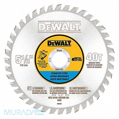 Circular Saw Blade Series DWA Blade Dia 5 1/2 in Max Blade Speed 4 200 RPM Arbor Size 25/32 in Arbor Shape Round Diamond Knockout No Number of Teeth 40 Max Cutting Depth 2 in Primary Material Application Stainless Steel Materials Cut Stainless Steel Metal Cutting Type Solid Stock Cut Width 0.06 in Tip Material Carbide Tipped Hook Angle 10 Degrees Tooth Grind MTCG For Use With Saw Type Circular Saws Blade Type Stainless Steel Cutting Plate Thickness 0.044 in
