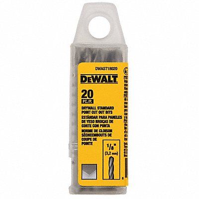 Cut Out Bit Drill Bit Diameter 1/8 in Max Speed 26 000 RPM Shank Diameter 1/8 in Overall Length 60 mm Bit Application Drywall Primary Material Application Drywall Material High Speed Steel Tip Style Cutting Finish Bright Flute Length 35 mm Cutting Direction Right Hand Number of Flutes 2 Cutting Depth 35 mm Tool Brand DEWALT(R) Package Quantity 20