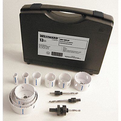 Hole Saw Kit Materials Cut Metal Plastics Sheet Metal Wood Arbor Design Not Included Tooth Material Bi-Metal Teeth per Inch 4/6 Max Cutting Depth 1 1/2 in Impact Rated No Number of Hole Saws 10 Saw Size Range 7/8 in to 4 1/2 in Hole Saw Sizes (Hole Saws) 7/8 in 1 1/8 in 1 3/8 in 1 3/4 in 2 in 2 1/2 in 3 in 3 5/8 in 4 1/8 in 4 1/2 in Thread Size 1/2 In.-20 5/8 In.-18 Shank Size 7/16 in Hex Pilot Drill Size 1/4 in dia x 4 in L Number of Pieces 13