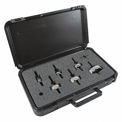 Hole Cutter Kit Primary Material Application Metal Materials Cut Electrical Works Metalworking Plumbing Arbor Design Built-In Tooth Material Carbide Tipped Max Cutting Depth 1/8 in Impact Rated No Hole Cutter Sizes (Hole Cutters) 7/8 in 1 1/8 in 1 3/8 in 1 3/4 in 2 in 2 1/2 in Saw Size Range 7/8 in to 2 1/2 in Number of Hole Cutters 6 Thread Size 5/8 In.-18 Shank Size 3/8 in Pilot Drill Size 1/4 in dia x 2 3/4 in L Number of Pieces 9