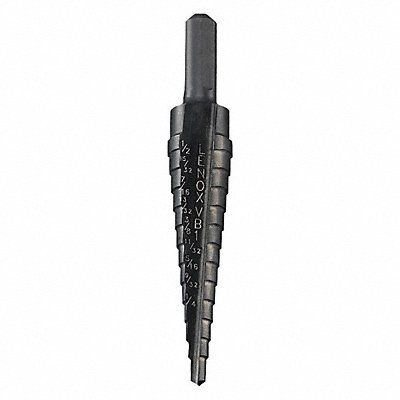 Step Drill Bit High Speed Steel Black Oxide 1/8 in to 1/2 in Size Range Hex 1/4 in Shank Hex Size 1/4 in Shank Diameter 3 in Overall Length Maximum Drilling Depth 1 in