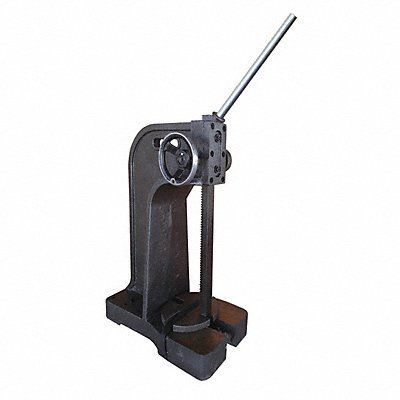 Ratcheting Arbor Press Force in Tons 3 ton Swing (In.) 13 1/4 in Table Work Surface (In.) 8 1/2 x 10 in Anvil Dia Work Area (In.) 7 13/16 in Range of Slot Widths (In.) 1 to 2 Max Work Height (In.) 17 1/2 in Ram Dimensions (In.) 1-1/4 x 1-1/4 in Ram Hole Dia x Depth (In.) 1/2 x 1 in Height (In.) 28 in Width (In.) 10 in Depth (In.) 22 1/4 in Base Size (In.) 10 x 21-1/4 in Cast Iron Construction Features 4 Position Rotating Anvil a magnetic insert to hold the punch.