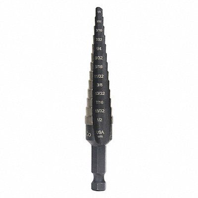 Step Drill Bit High Speed Steel Black Oxide 1/8 in to 1/2 in Size Range Hex 1/4 in Shank Hex Size 3 3/16 in Overall Length Maximum Drilling Depth 1/8 in