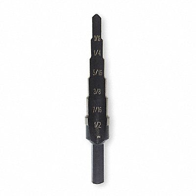Step Drill Bit High Speed Steel Black Oxide 3/16 in to 1/2 in Size Range Hex 1/4 in Shank Hex Size 3 1/4 in Overall Length Maximum Drilling Depth 5/16 in