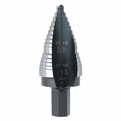 Step Drill Bit High Speed Steel Black Oxide 7/8 in to 1 1/8 in Size Range Straight with Three Flats 3/8 in Shank Diameter 2 7/8 in Overall Length Maximum Drilling Depth 1/8 in
